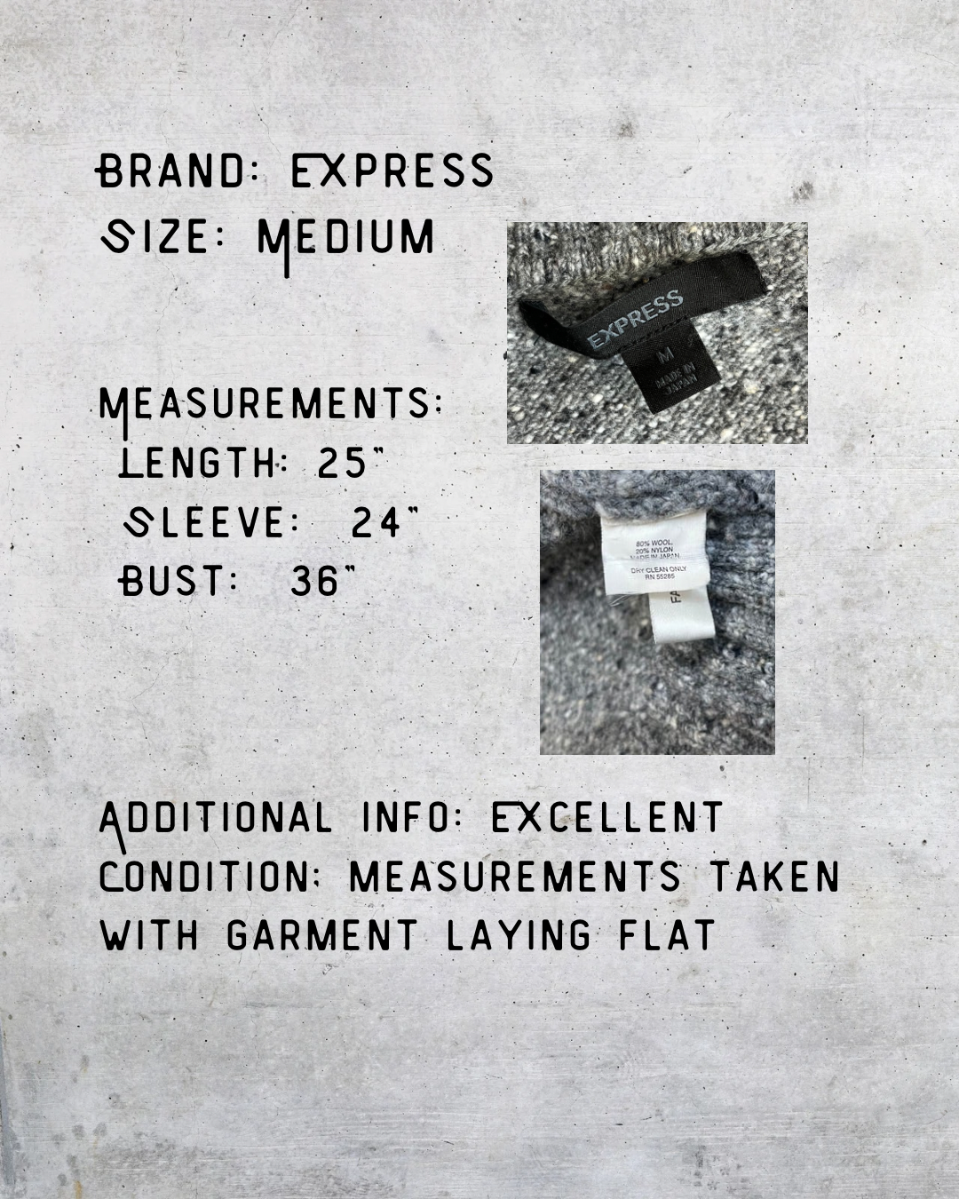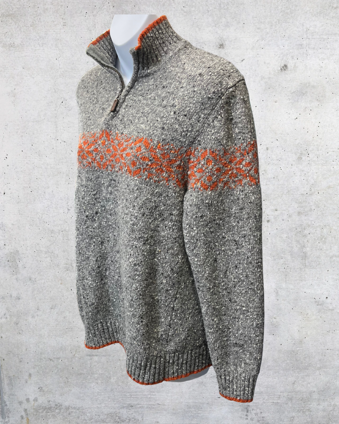 Soft gray knit quarter zip sweater from Express with a subtle orange patterned band across the chest and orange trim details. Cozy texture, easy fit, and great for layering when it’s cold but not parka-level cold. Clean, simple, and quietly cool.