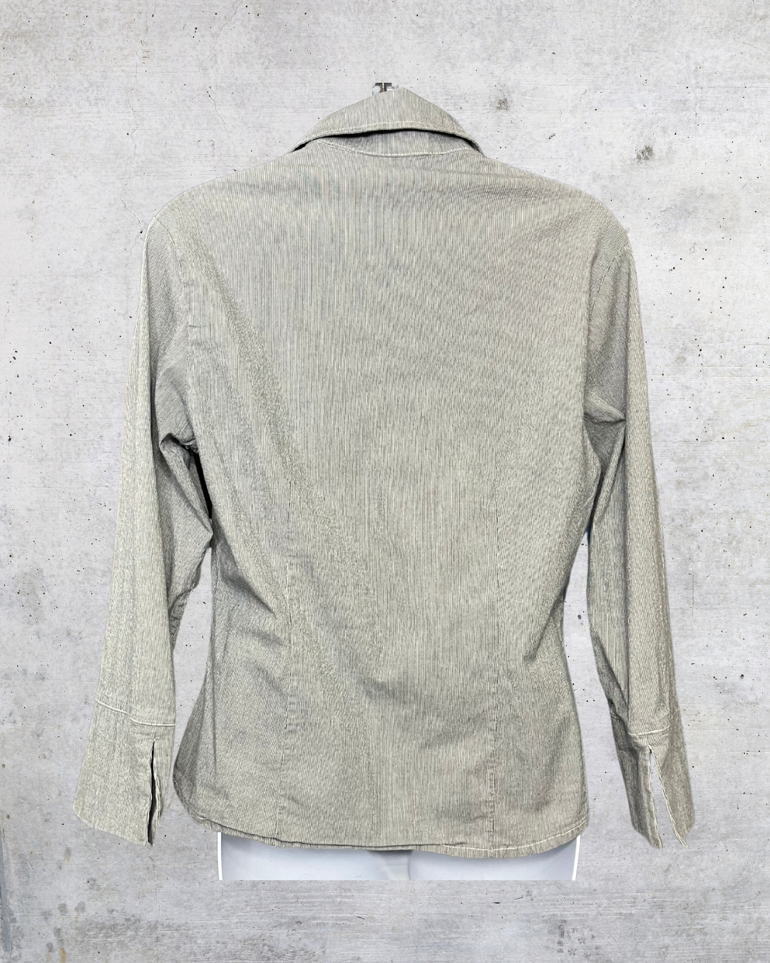 A clean, minimalist button-up with subtle micro-stripes and that effortless vibe. Soft, easy to wear, and great for layering. Small bleach speck on the sleeve, but still a go-to neutral you’ll grab on repeat.