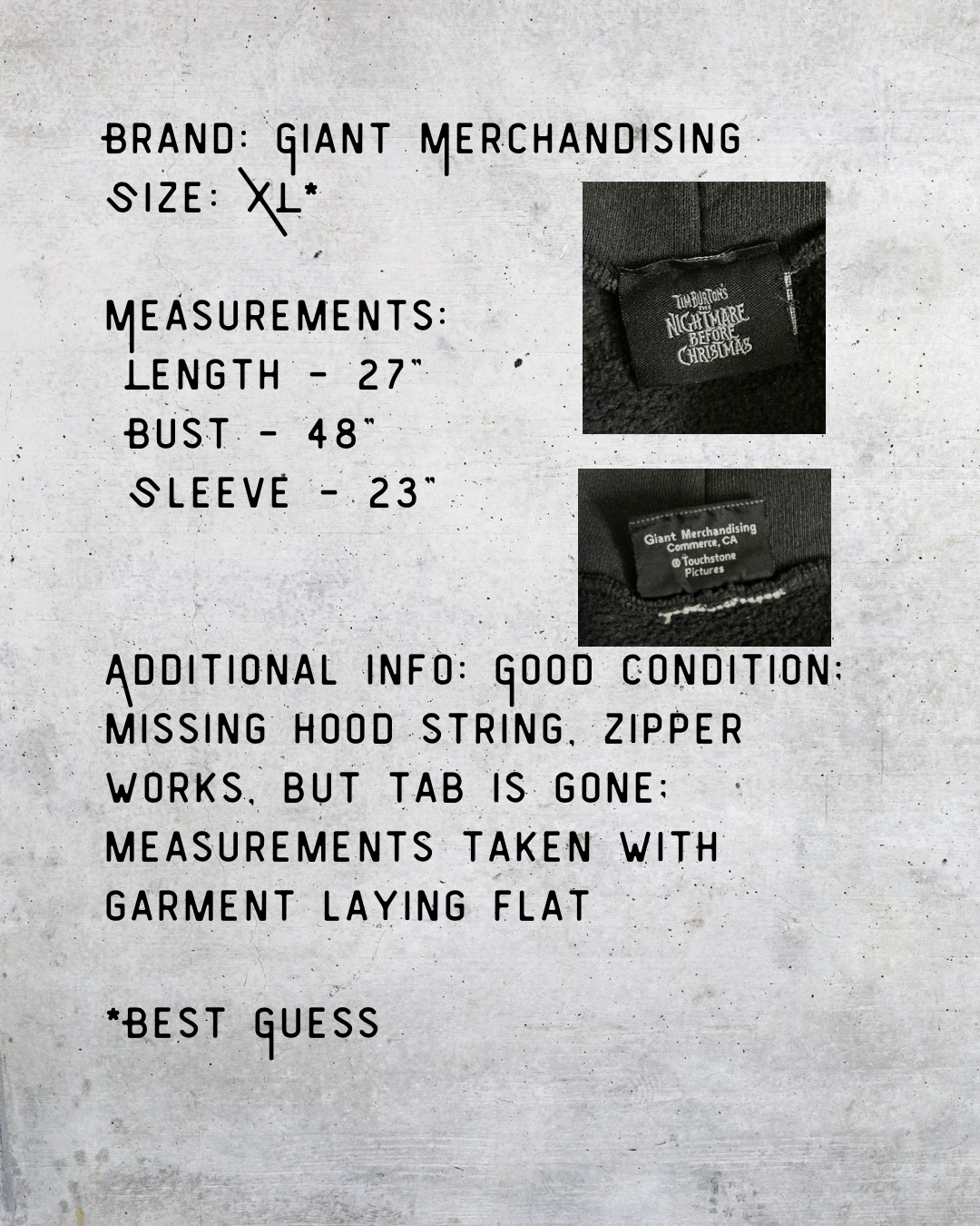 Step into spooky comfort with this Jack Skellington full-face hoodie from Giant Merchandising. The cracked graphic gives it that perfectly aged Halloween energy, and the oversized fit makes it a throw-on-and-go essential. Note: hood string + zipper pull tab are missing, but zipper still works. A must-have for NBX fans.
