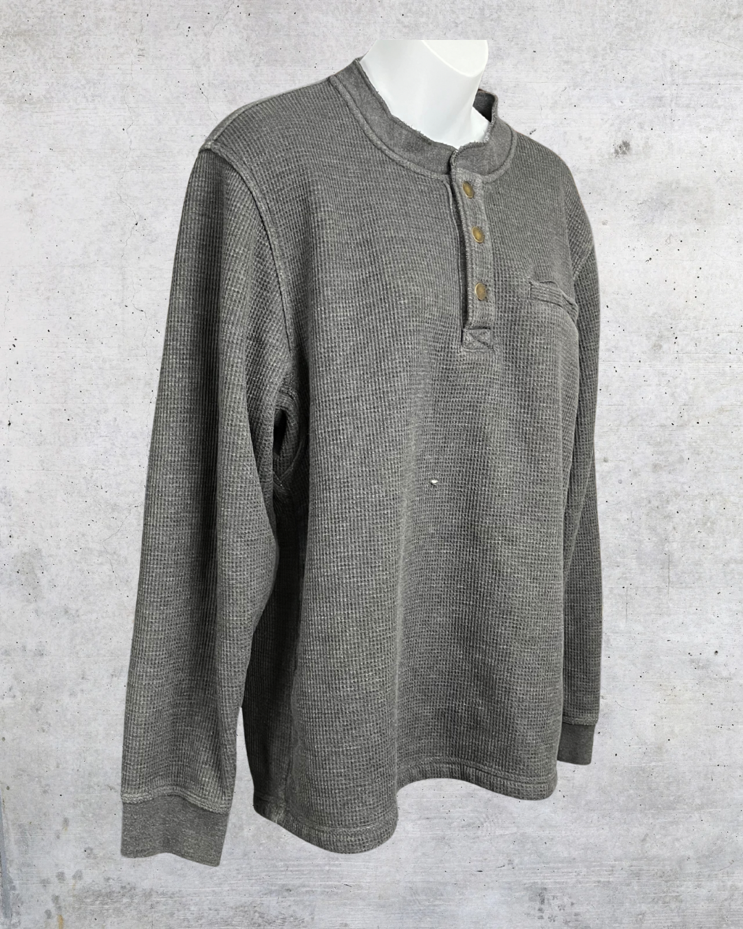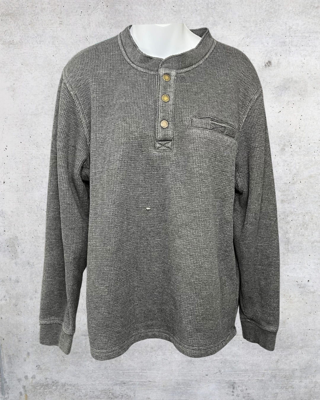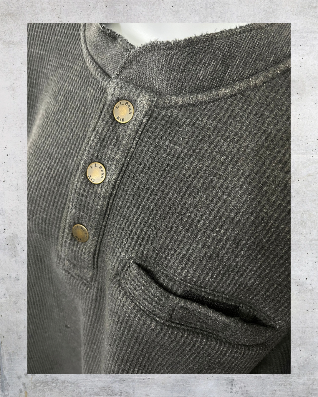 Your new cold-weather sidekick. This lined L.L. Bean waffle henley is warm, comfy, and built for the cozy season. Charcoal gray with brass snaps and a chest pocket for that rugged classic feel. Has a tiny hole on the front, but still packs major comfy–cute energy.