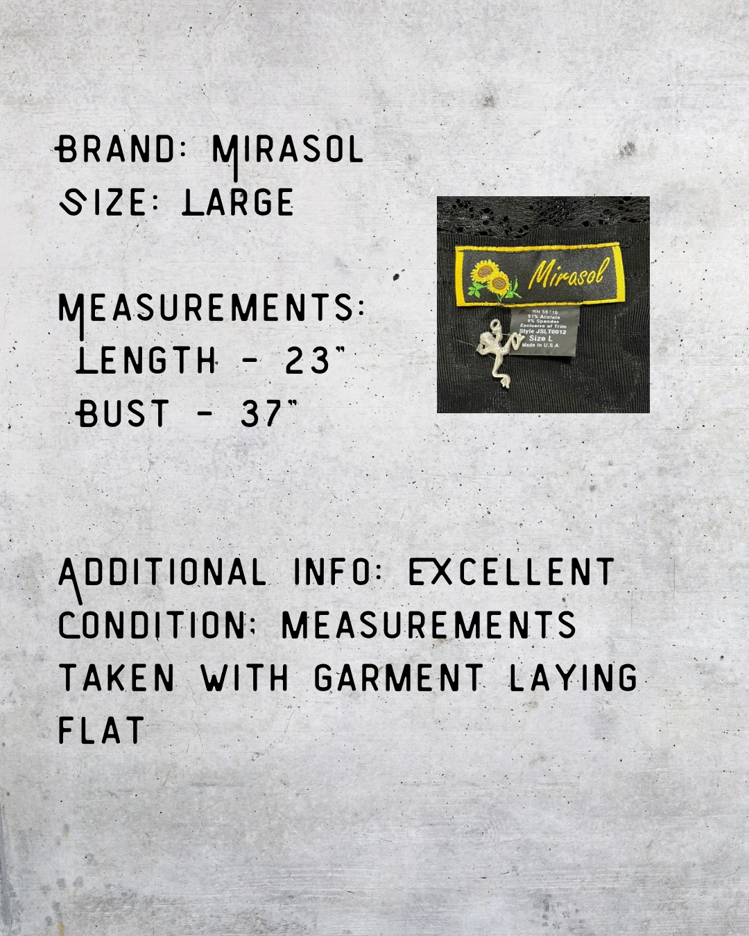 Straight outta the late ‘90s/early Y2K vault — this Mirasol tank is soft, stretchy, and sultry. Black velvet-look fabric with scalloped lace trim, made in the USA (and it shows). Flawless layering piece or wear it solo and make ‘em stare.
