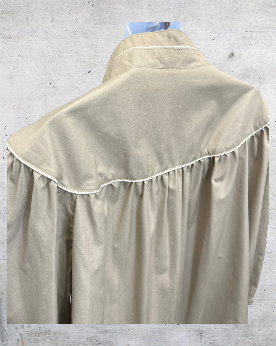 Pulled straight from a late-80s mall coat rack in the best way. Slouchy, oversized, lightweight, and perfectly broken-in. Neutral tan with subtle piping and that classic Misty Harbor shape everyone’s quietly hunting for again.
