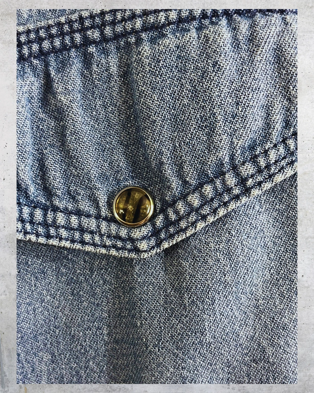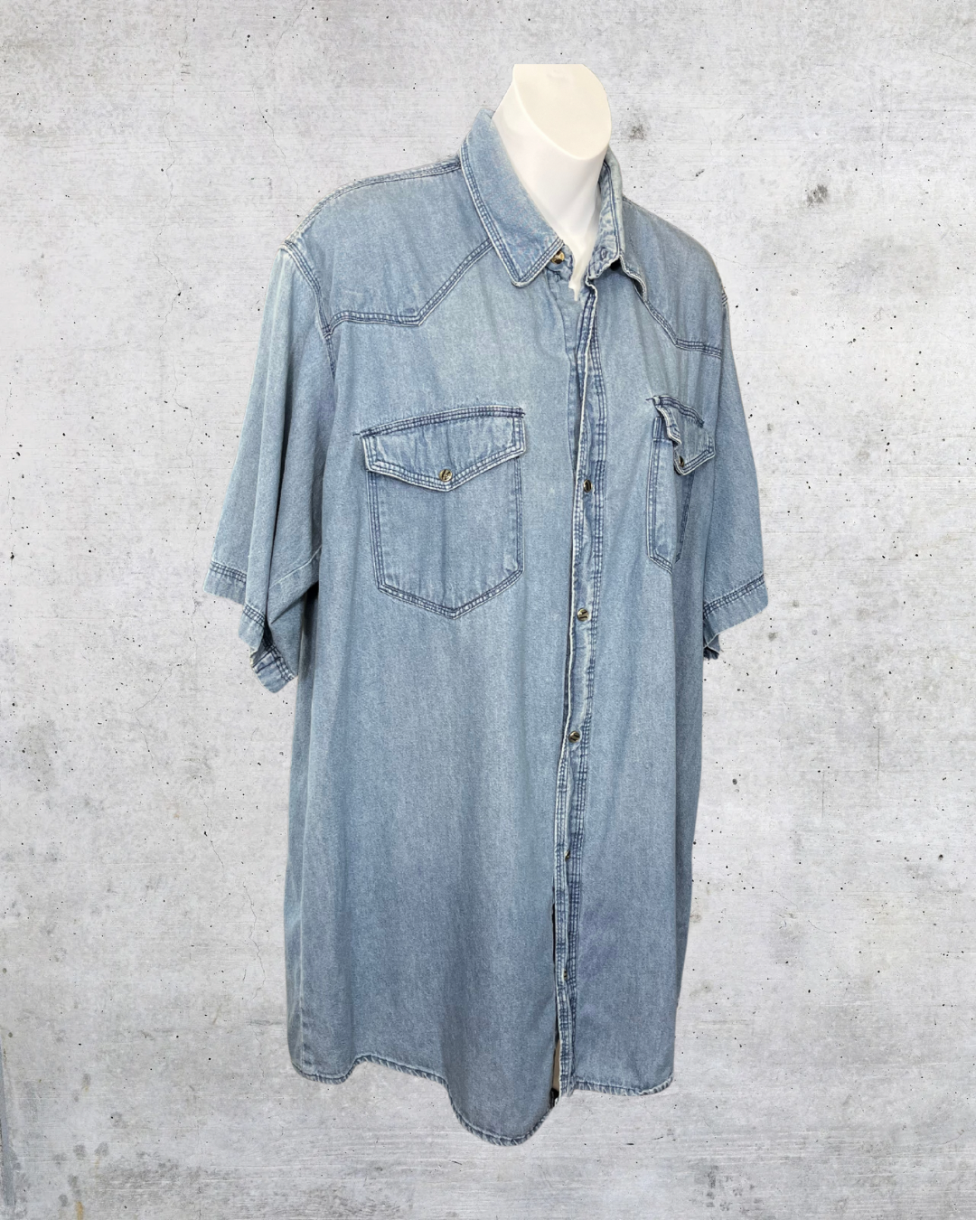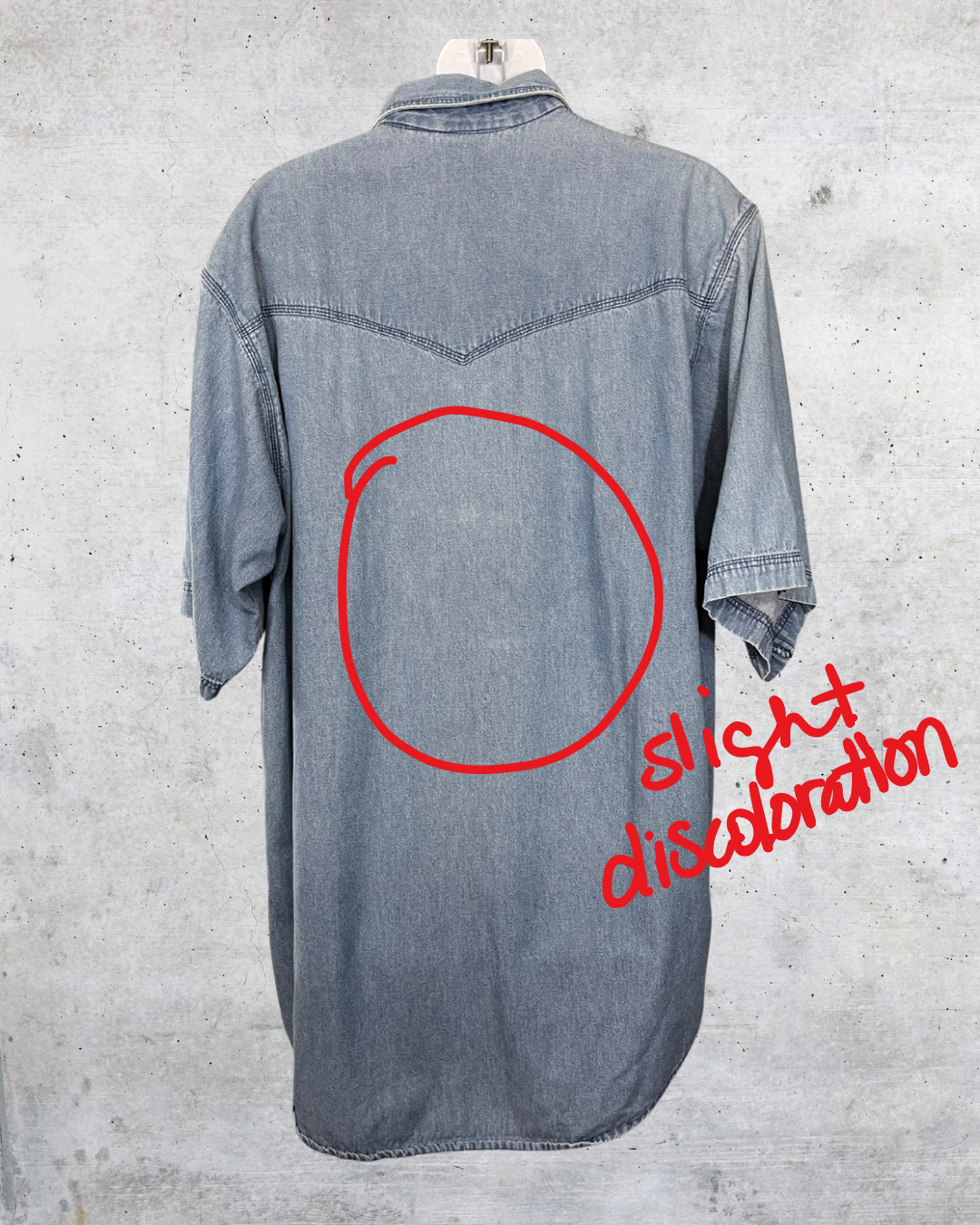 Classic short-sleeve denim button-up with Western seams and a naturally faded wash that gives off that easygoing, worn-in look. Slight discoloration on the back (shown in pics) — just enough to add character. Perfect for laid-back days, layering, or that subtle cowboy-core edge.