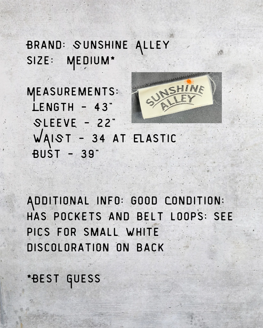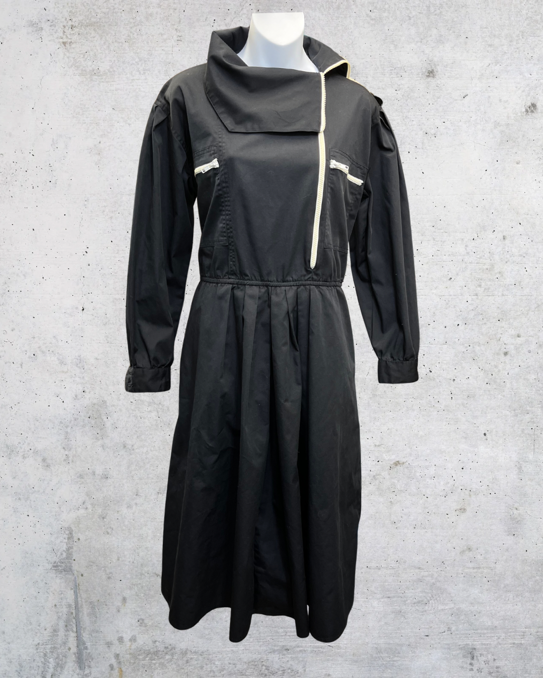 Straight outta the early 1980s and absolutely doing the most. This Sunshine Alley dress has that perfectly weird vintage utility vibe—dramatic fold-over zip collar, contrast zipper details, elastic waist, pockets, and belt loops because of course it does. Structured but slouchy, slightly space-age, slightly art-teacher-on-a-mission.