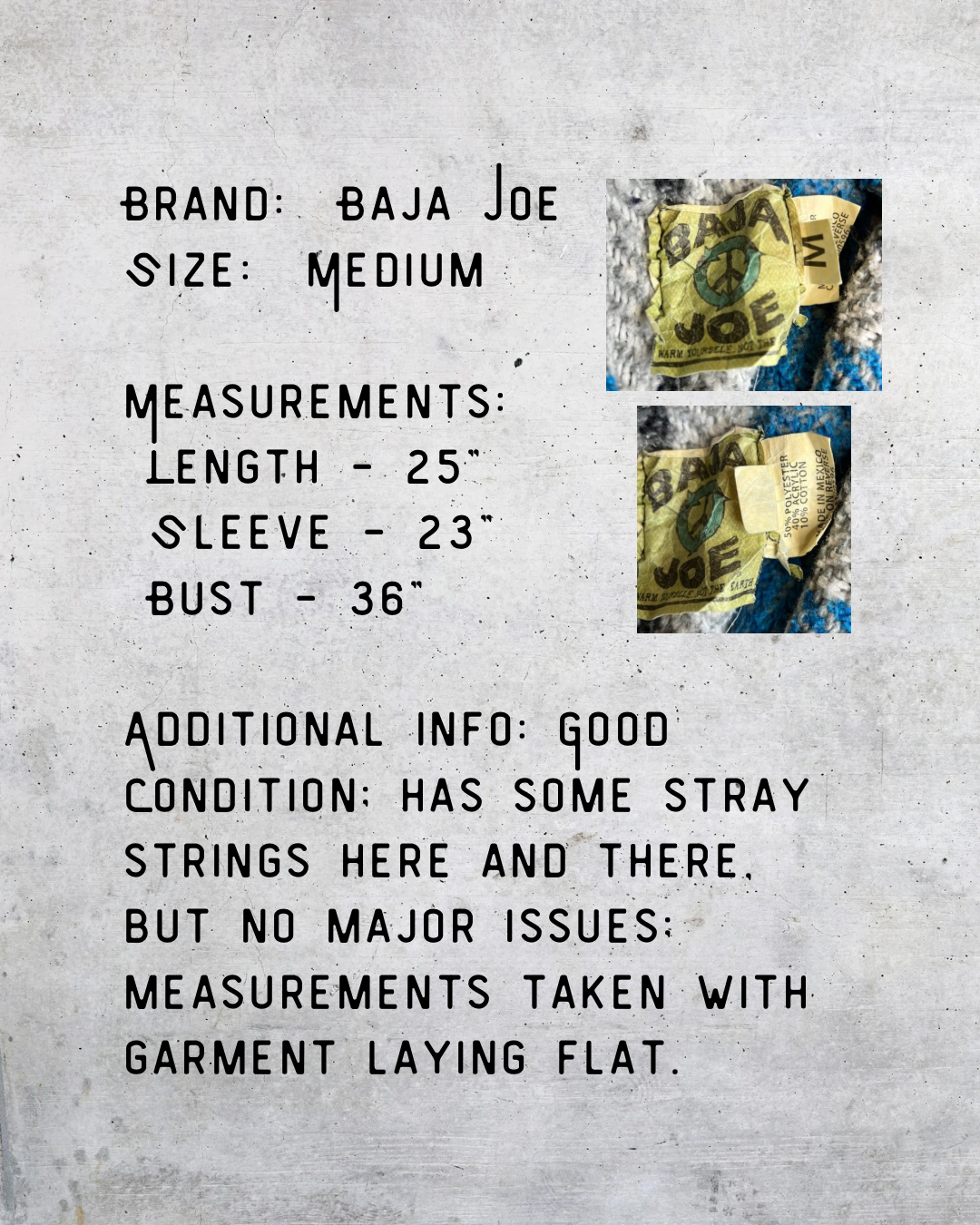 Authentic vintage Baja Joe drug rug hoodie from the 1990s. Heavy woven cotton with classic blue, gray, and black striping. Relaxed fit with the traditional Baja hood and front pouch pocket. Made in Mexico with that real-deal texture modern versions never quite get right. Shows some stray strings here and there, which is typical for vintage woven Baja hoodies—no major issues.