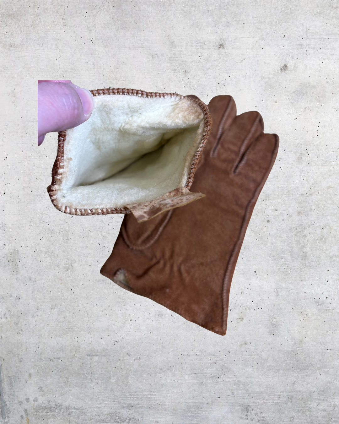 Soft brown suede gloves by Crown Craft, made in Korea and lined with plush rayon pile for warmth. Classic tailored shape with a timeless, understated look that feels very 1960s —practical, well-made, and meant to last.
